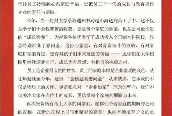 員工是企業(yè)最寶貴的財富,員工的家庭幸福是企業(yè)溫暖的底色。從往年延續(xù)至今年,這份 “金榜題名慰問金” 從未缺席,它承載的不僅是物質(zhì)上的關(guān)懷,更是張總對 “企業(yè)如家” 理念的堅守:我們不僅關(guān)注大家在崗位上的成長,更珍惜每個家庭的期盼與未來!